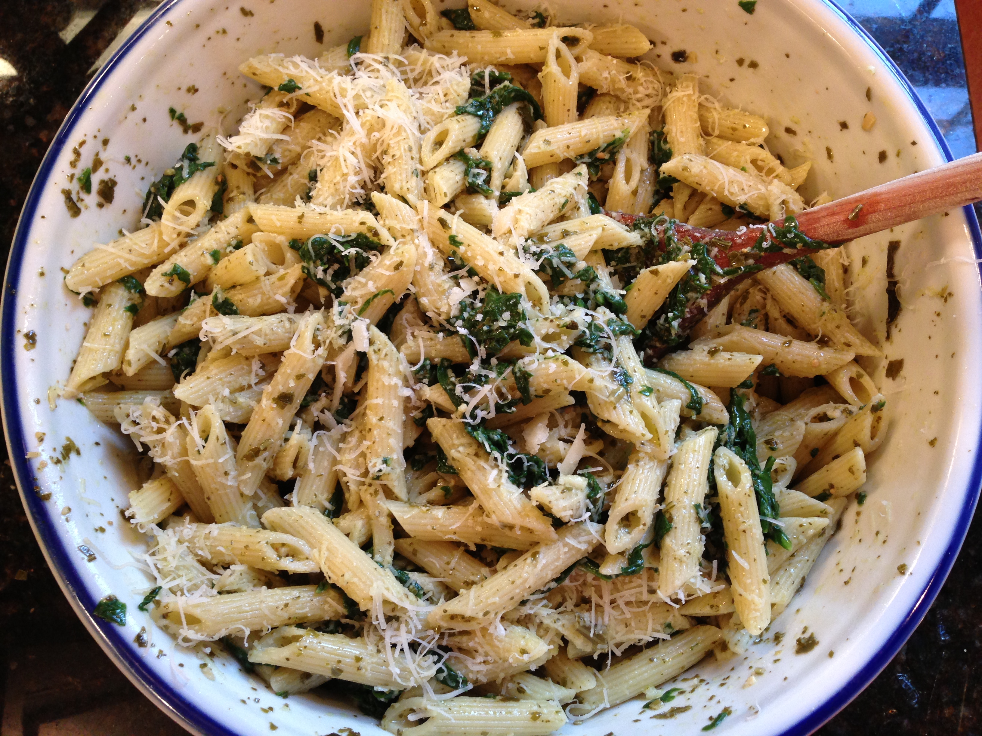 Now that school is in full swing, the weekly menu revolves around meals that can be made in 30 minutes or less. Since I absolutely love pesto (I have been known to eat it straight from the jar!), this recipe fits the bill perfectly. One pot, one bowl, a green vegetable and some fresh grated parmesan cheese make for a delicious dinner and easy clean-up on those hectic nights.